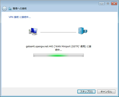 「次へ」をクリックすると、10 - 30 秒程度アニメーションが表示され、SSTP プロトコルを用いた VPN